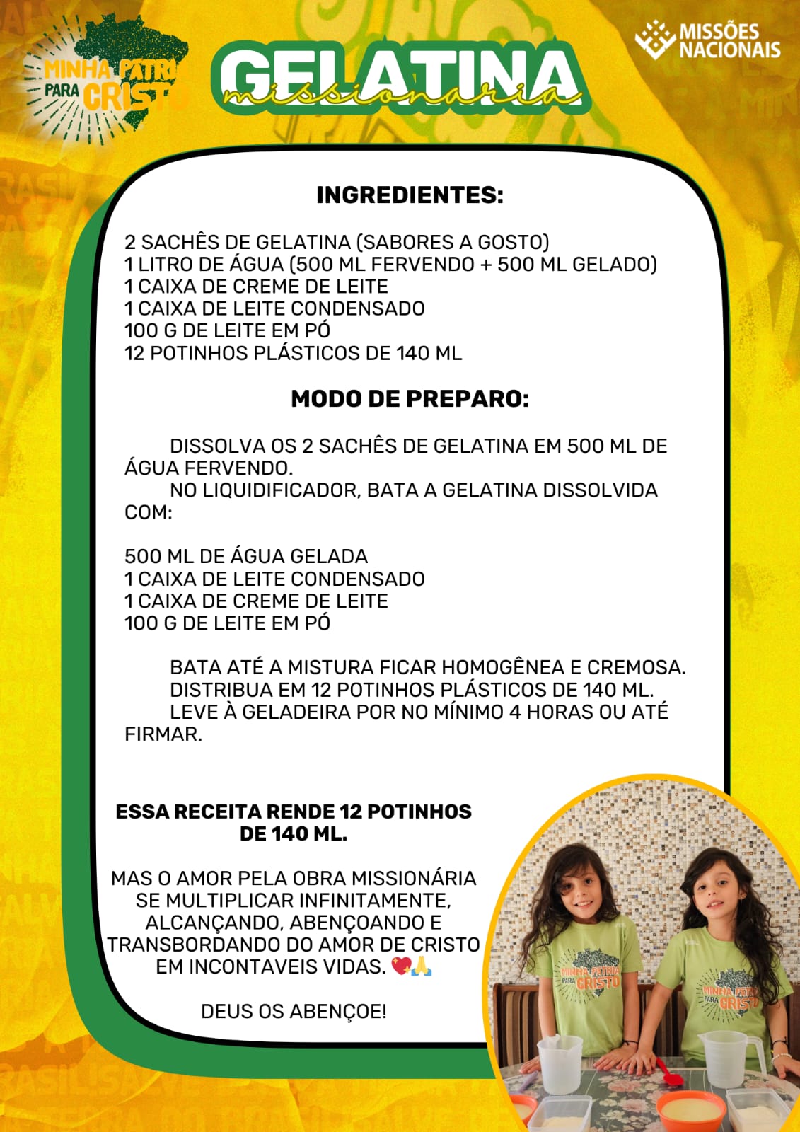 Com dedicação e alegria, elas mesmas fazem as gelatinas e saem pelas ruas vendendo. Parabéns, queridas missionárias, pelo empenho e exemplo tão inspirador! Também registramos nossa admiração aos pais, Pr. Pedro e Jussara Encina, que têm ensinado com sabedoria às filhas o amor por missões.