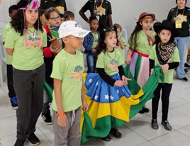 (Cinco crianças entram no palco, cada uma caracterizada para representar uma das cinco regiões do Brasil. Elas se posicionam à medida que vão entrando, segurando na ponta da saia do Brasil.)