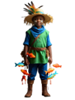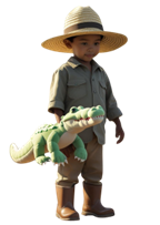 (Figurino: Explorador com roupas vibrantes em verde, azul e marrom, chapéu de palha ou folhas verdes. Acessórios que representem rios, como brinquedos de peixe, e elementos animais, ou penas coloridas/pinturas faciais simples para um toque tribal.)