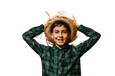 (Figurino: Chapéu de palha ou um adereço rústico.)