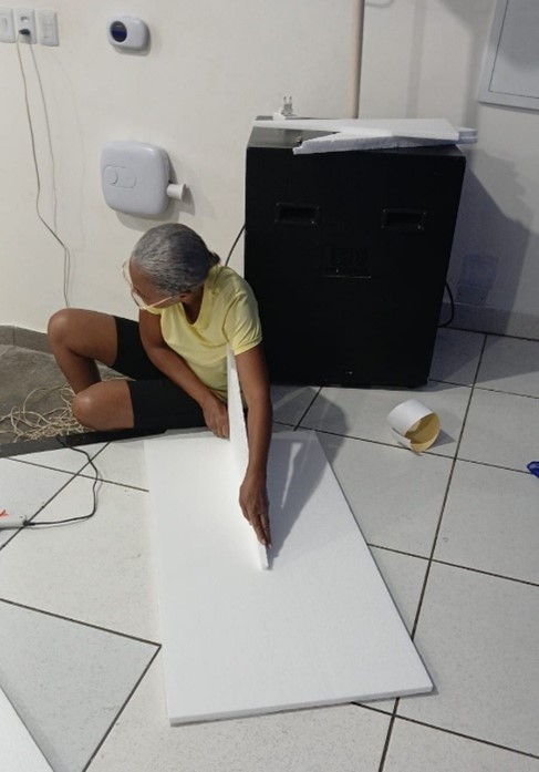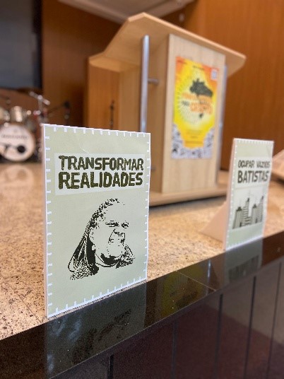 Para a púlpitos, também com o isopor, fizemos a impressão dos selos em tamanho A3, no papel fotográfico, com o suporte de isopor e cola fixamos as ênfases no chão.